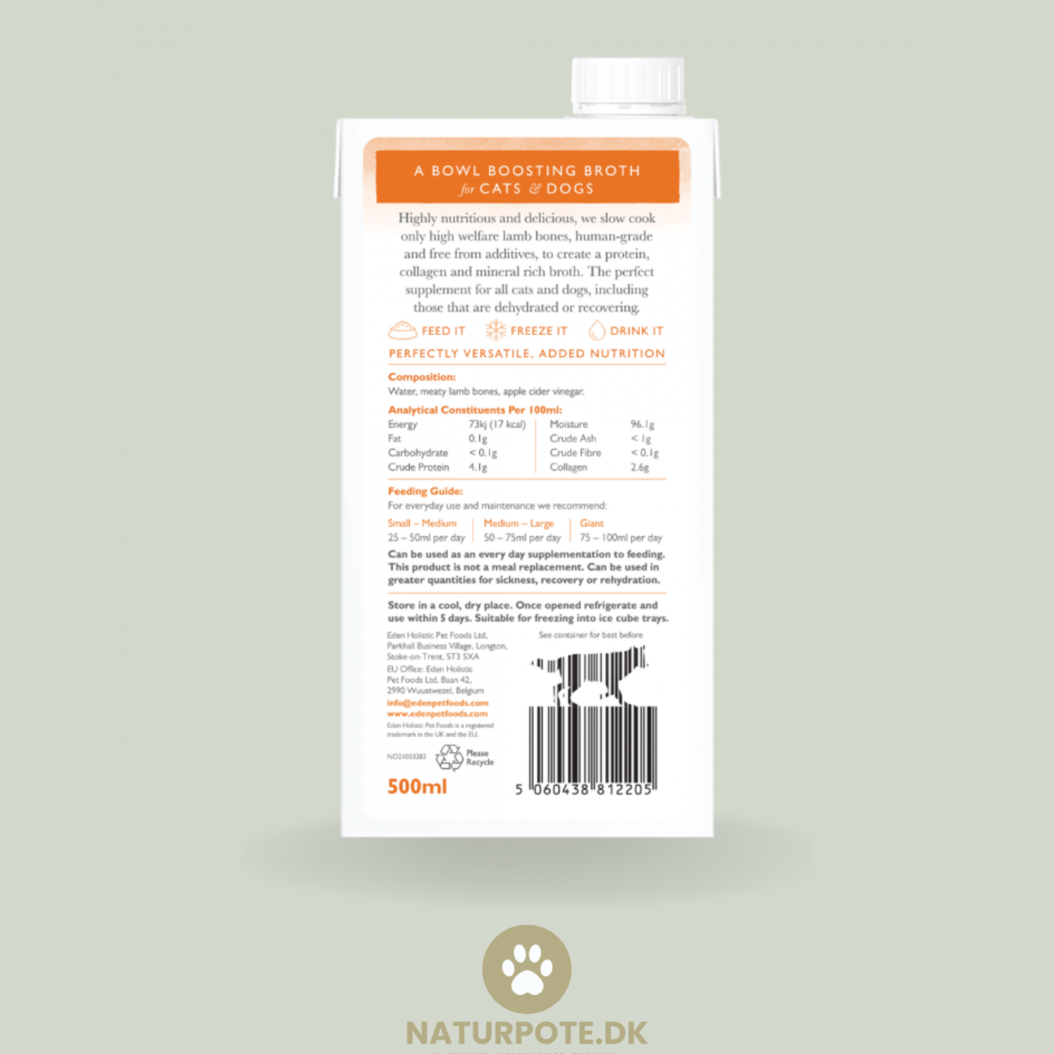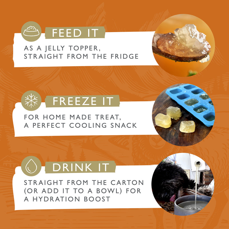 Uanset om du hælder den over tørfoder, fryser den til lækre godbidder eller serverer den som et hydrerende tilskud, fremmer bouillonen hydrering, restitution og immunforsvar – et perfekt dagligt supplement til dit kæledyrs kost.