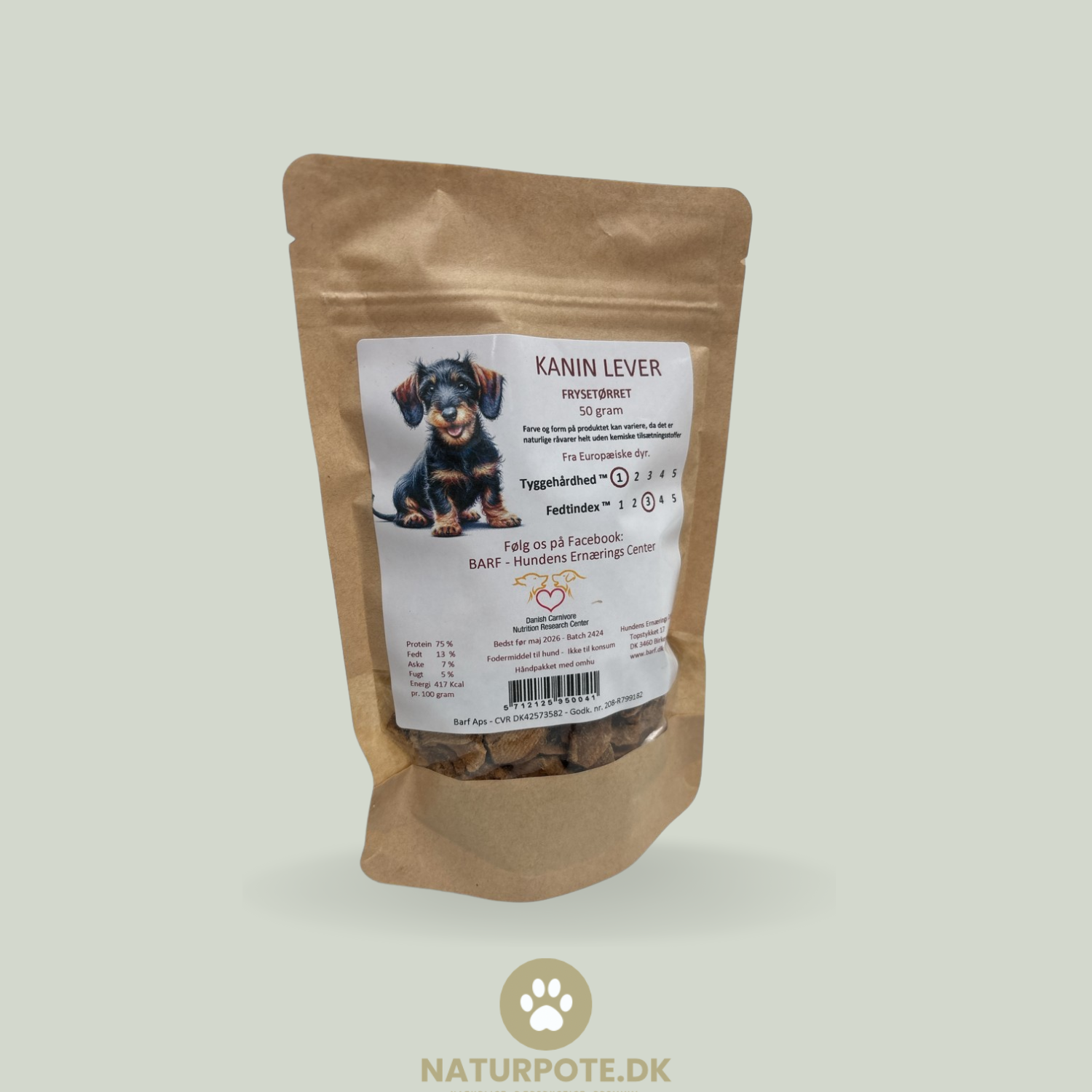 Frysetørret kanin lever har en tyggehårdhed på 1 og et fedtindex på 3